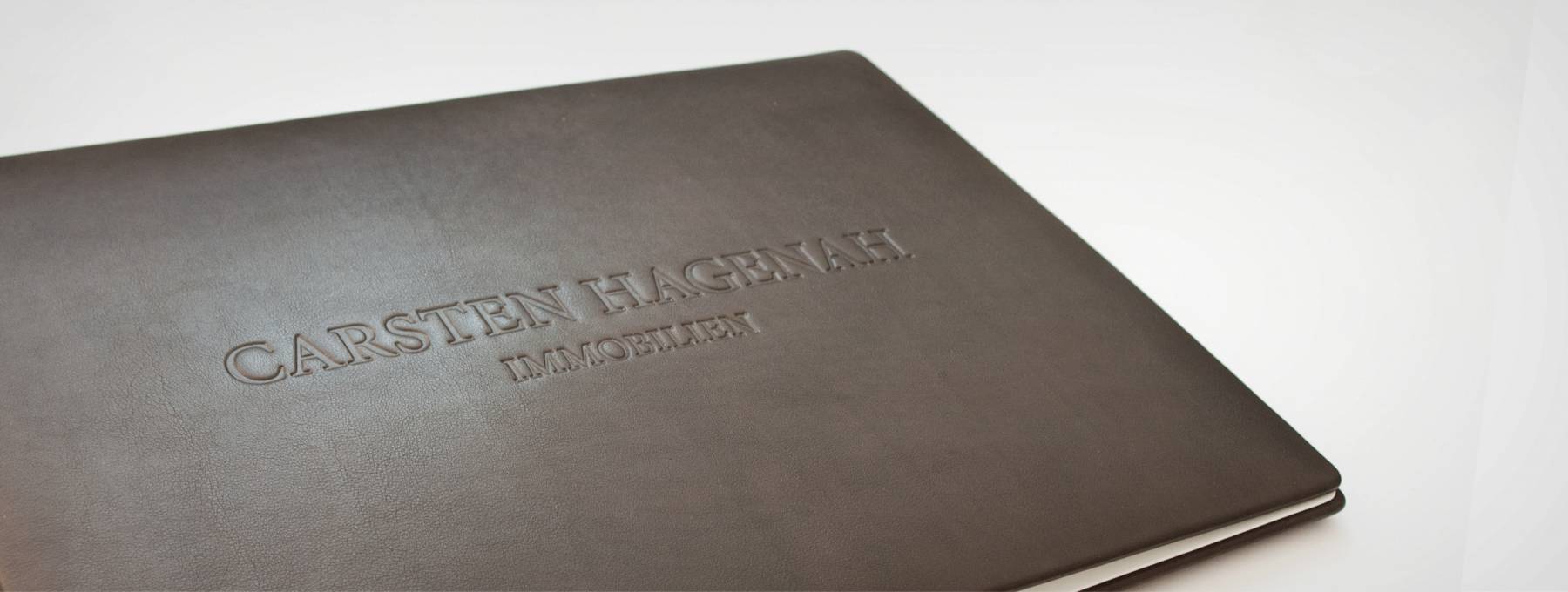 Die gute alte Fotografenmappe als Referenzenbuch – hier in feinstem Kern-Leder mit Tief-Prägung und einem austauschbaren Innenteil mit Prints der Objekte in hochwertigster Museumsqualität.